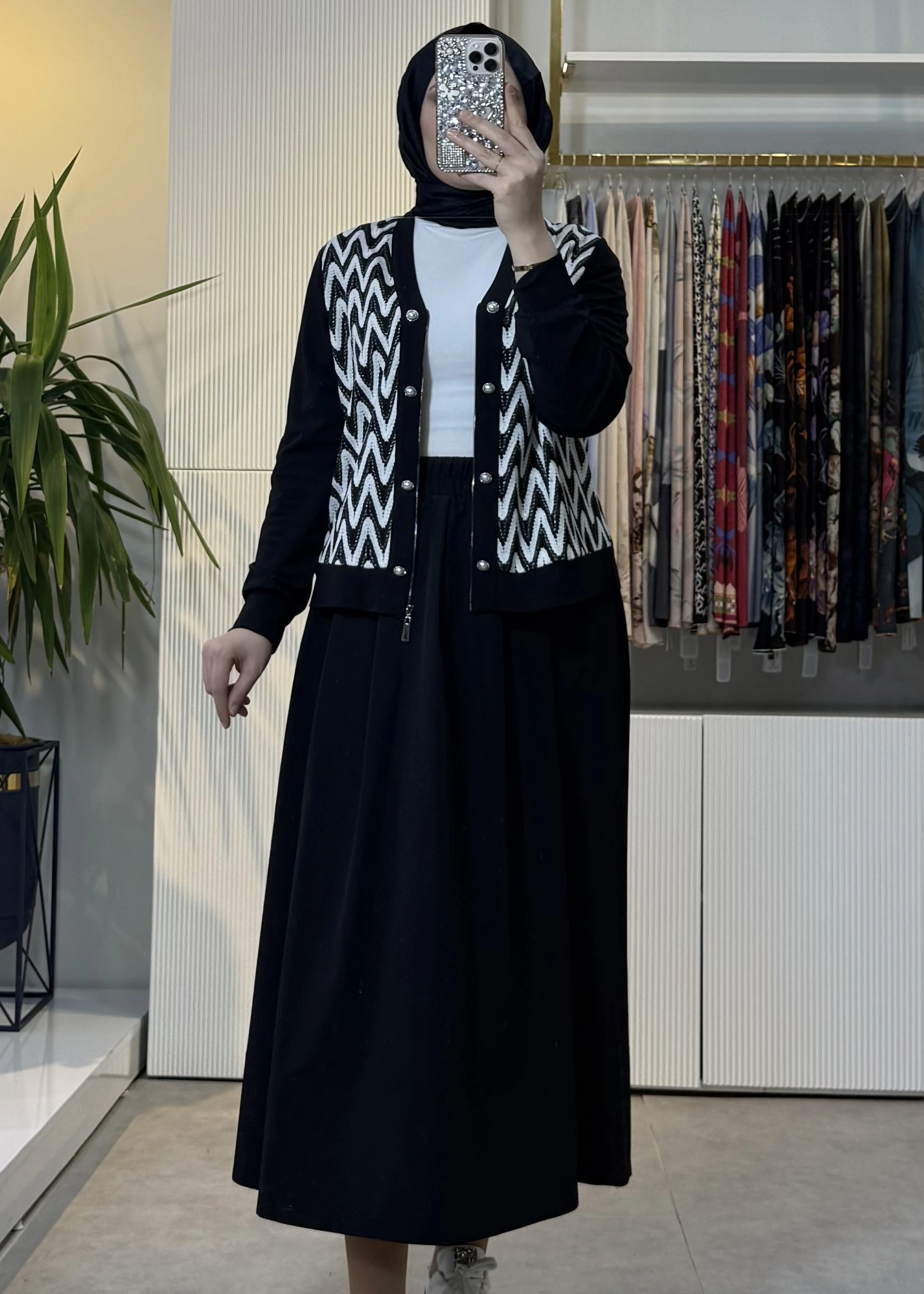 FUAT GÜRSEN Dantel İşlemeli İnci Düğme Detaylı Önden Fermuarlı Hırka Siyah 5614