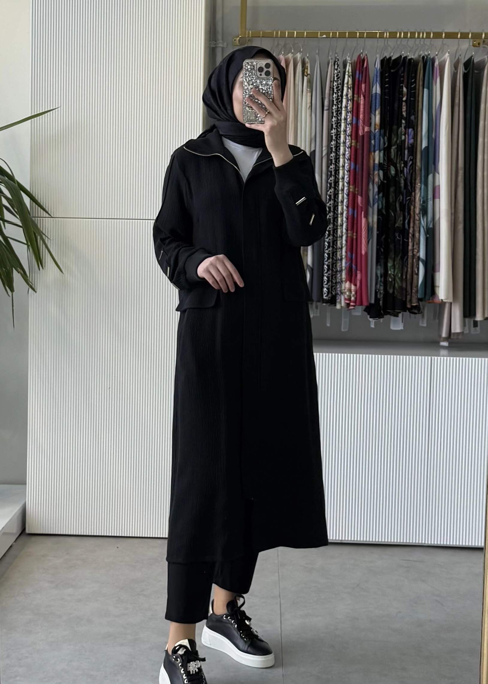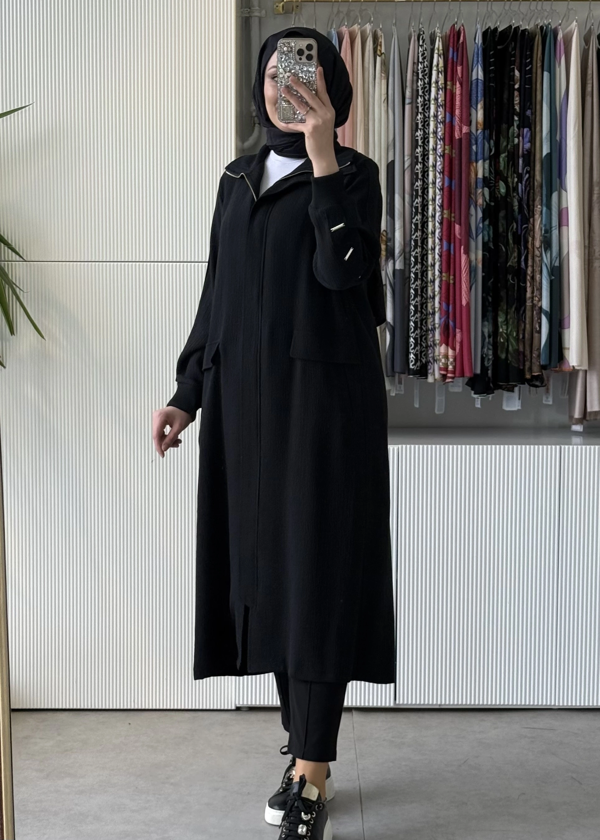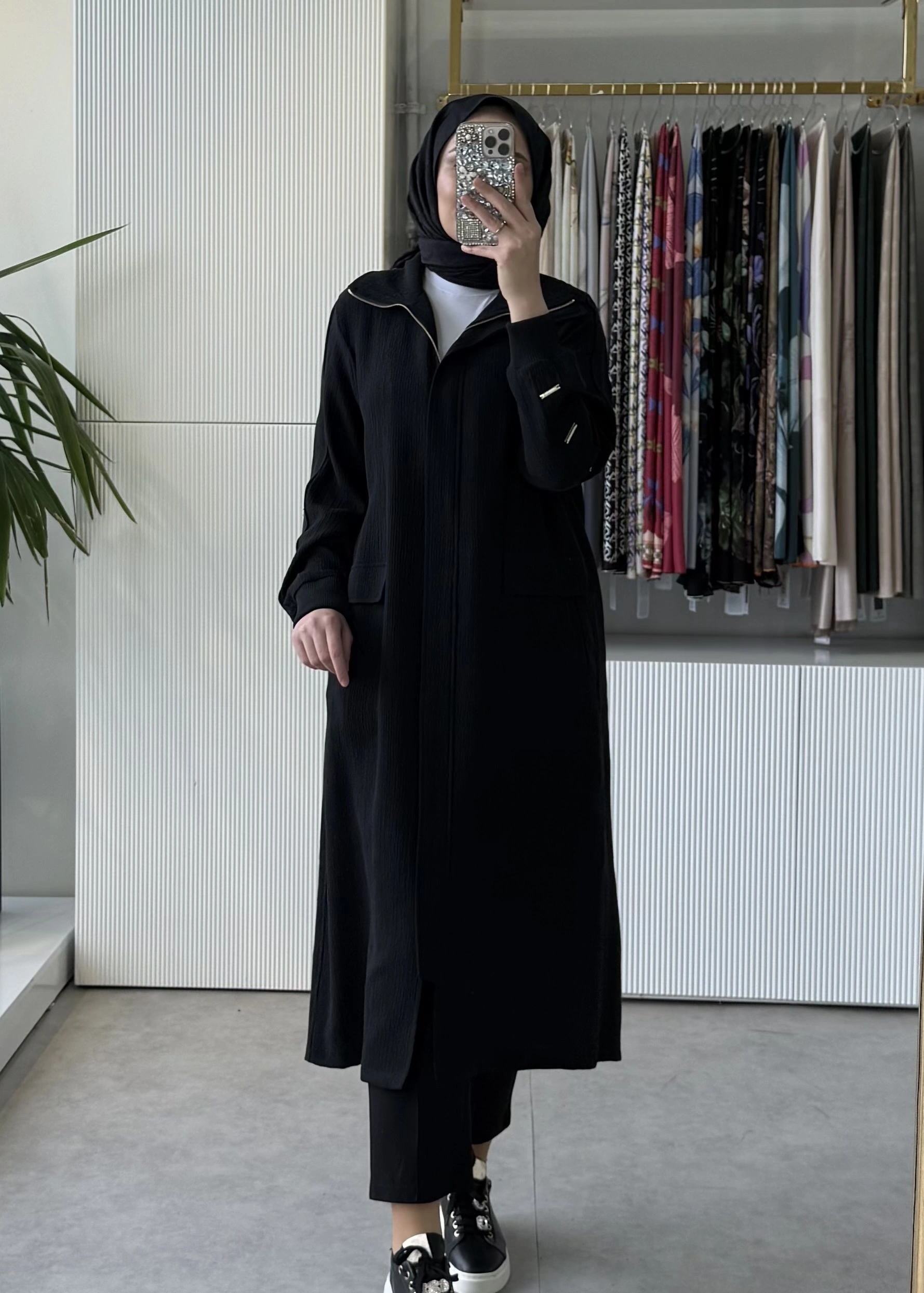FUAT GÜRSEN Kırıştırma Kumaş Önden Fermuarlı Tasarım Kap Siyah 5607