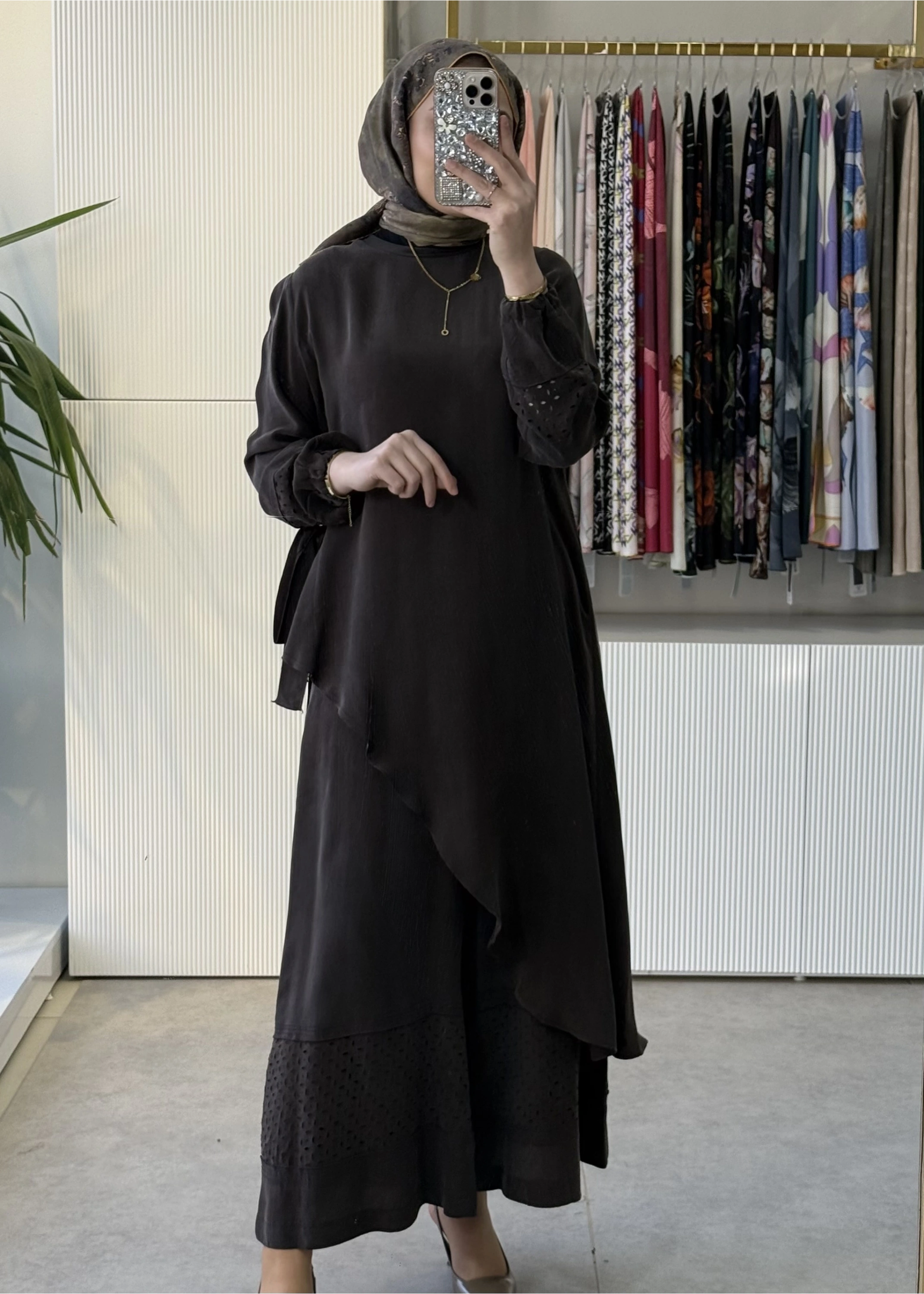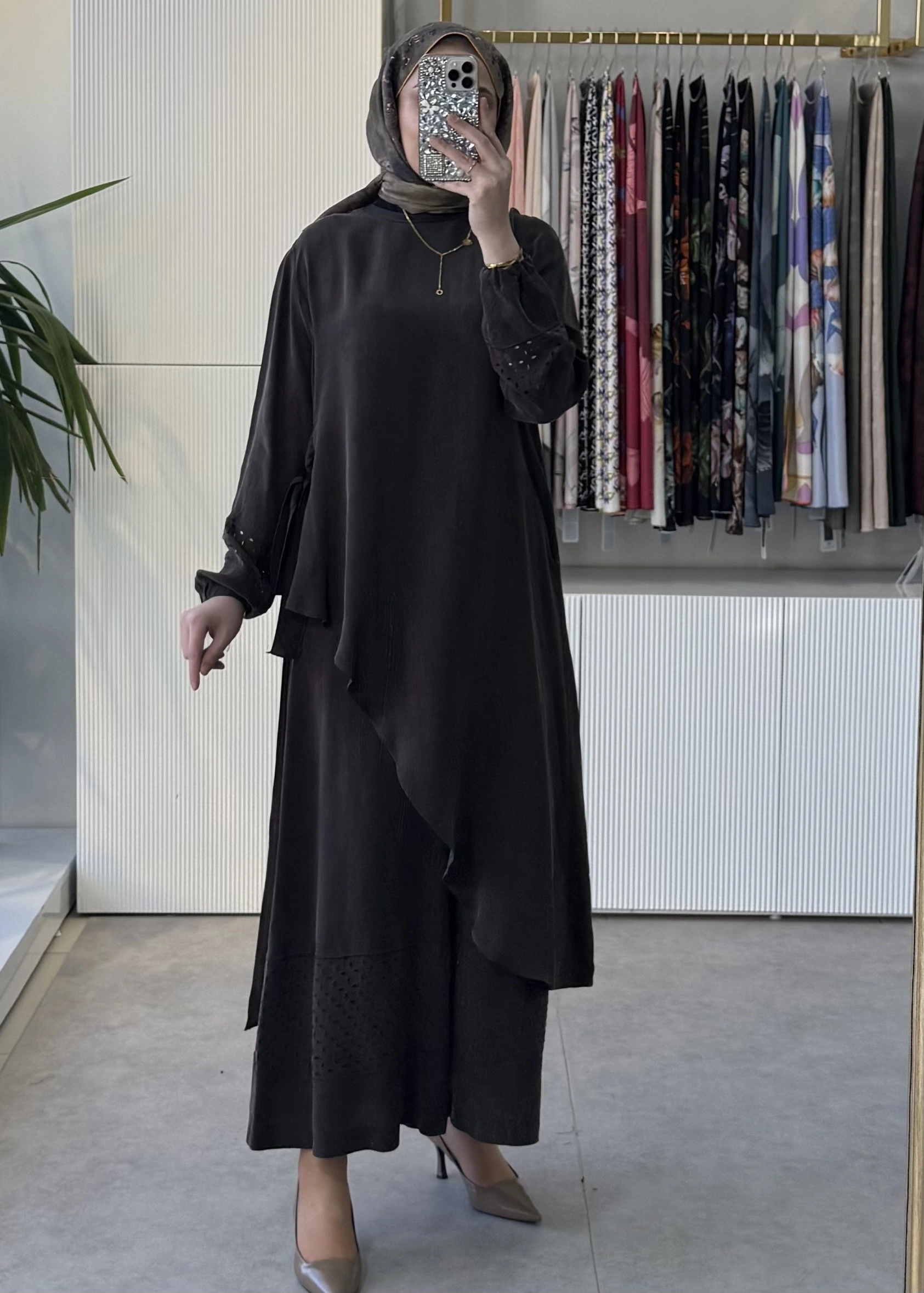 MissWhence 39003 Lazer Kesim Detaylı İpek Pantolonlu Takım Kahve