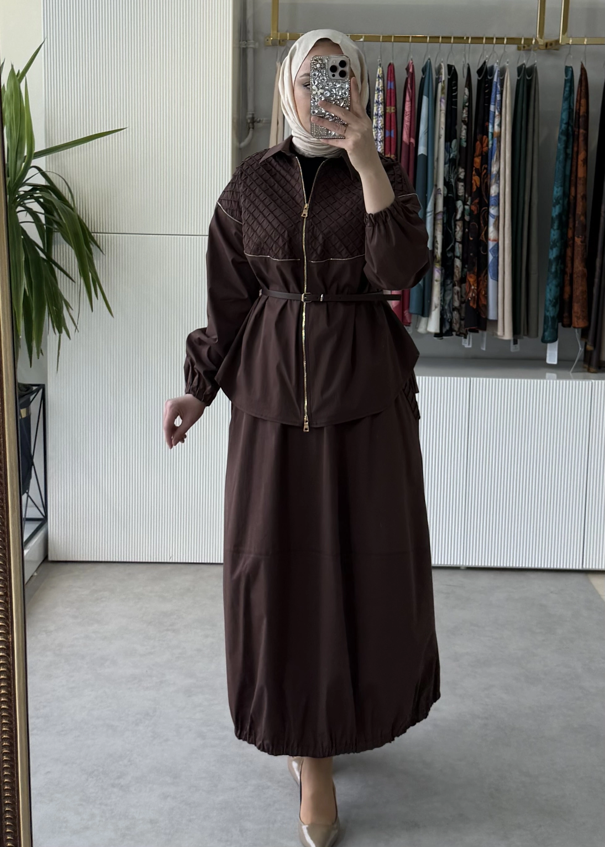MissWhence 39307 Drape ve Fermuar Detaylı Ceket Etek Takım Kahve
