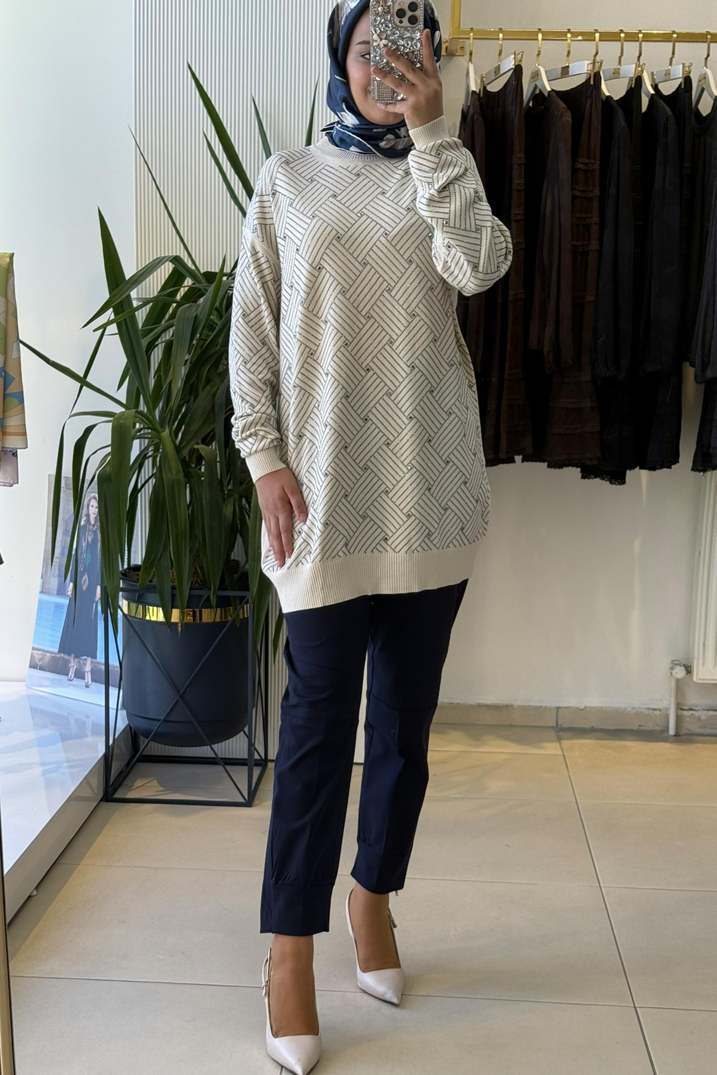 TIĞ TRİKO ÖNÜ KAFES TAŞ BASKILI TUNİK