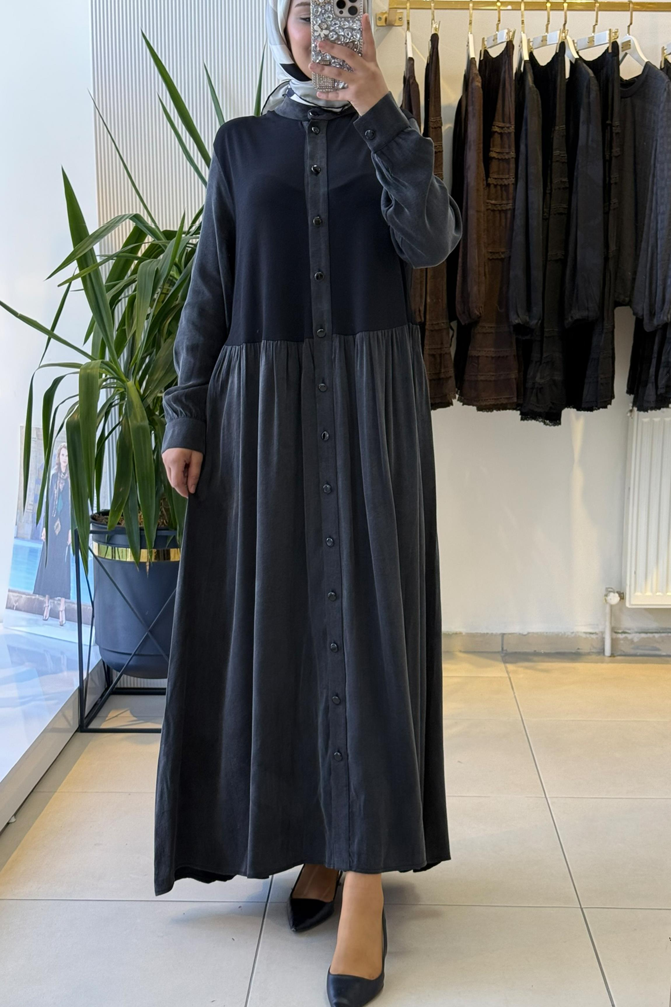 ÜST KISMI TRİKO, KOLLAR VE ETEK KISMI CUPRO İPEKTİR.