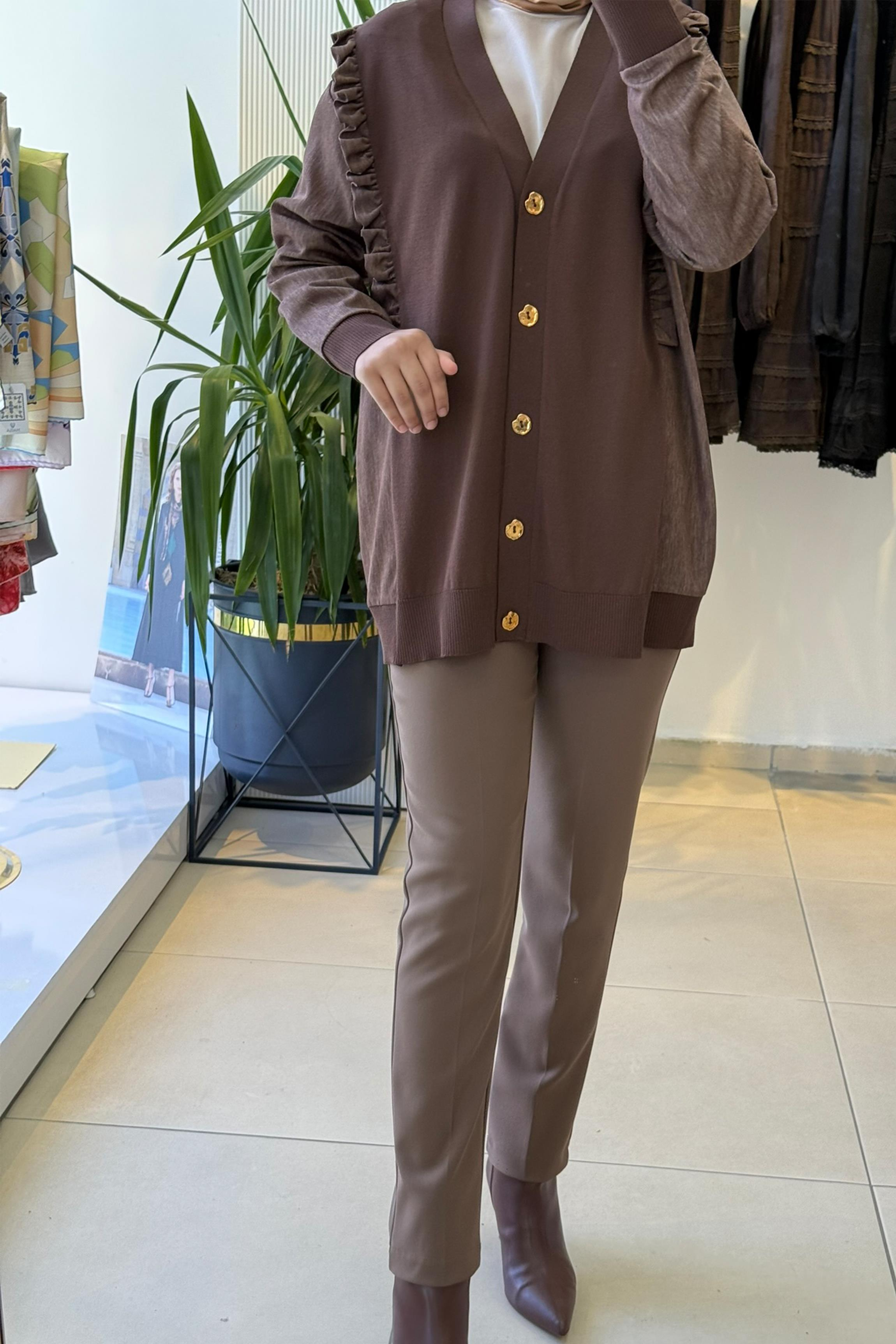 TIĞ TRİKO KOLU KOT DETAYLI TRİKO KOMBİNLİ HIRKA KAHVERENGİ