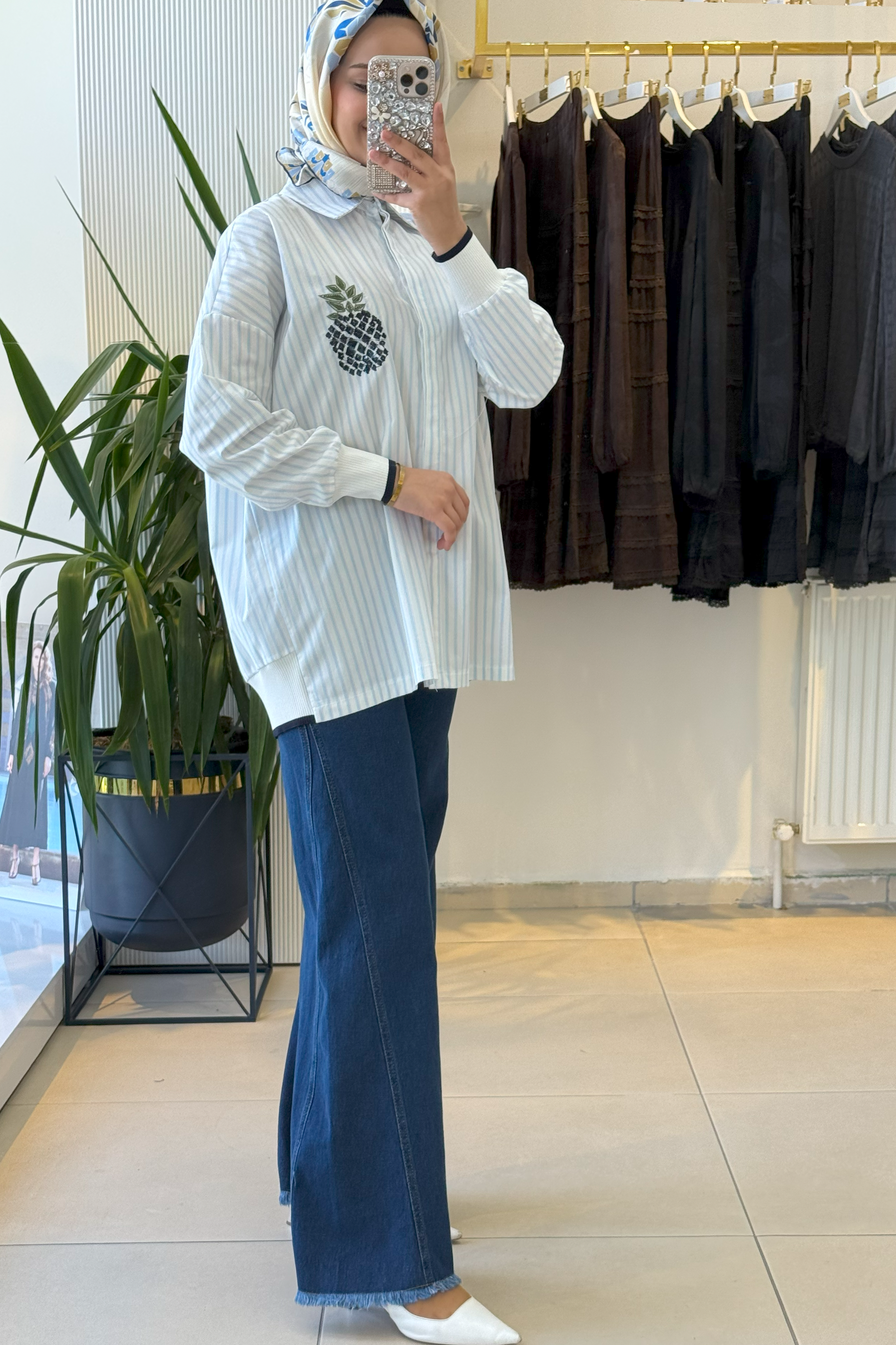 TIĞ TRİKO RİBANA DETAYLI NAKIŞLI ÇİZGİLİ POPLİN GÖMLEK MAVİ