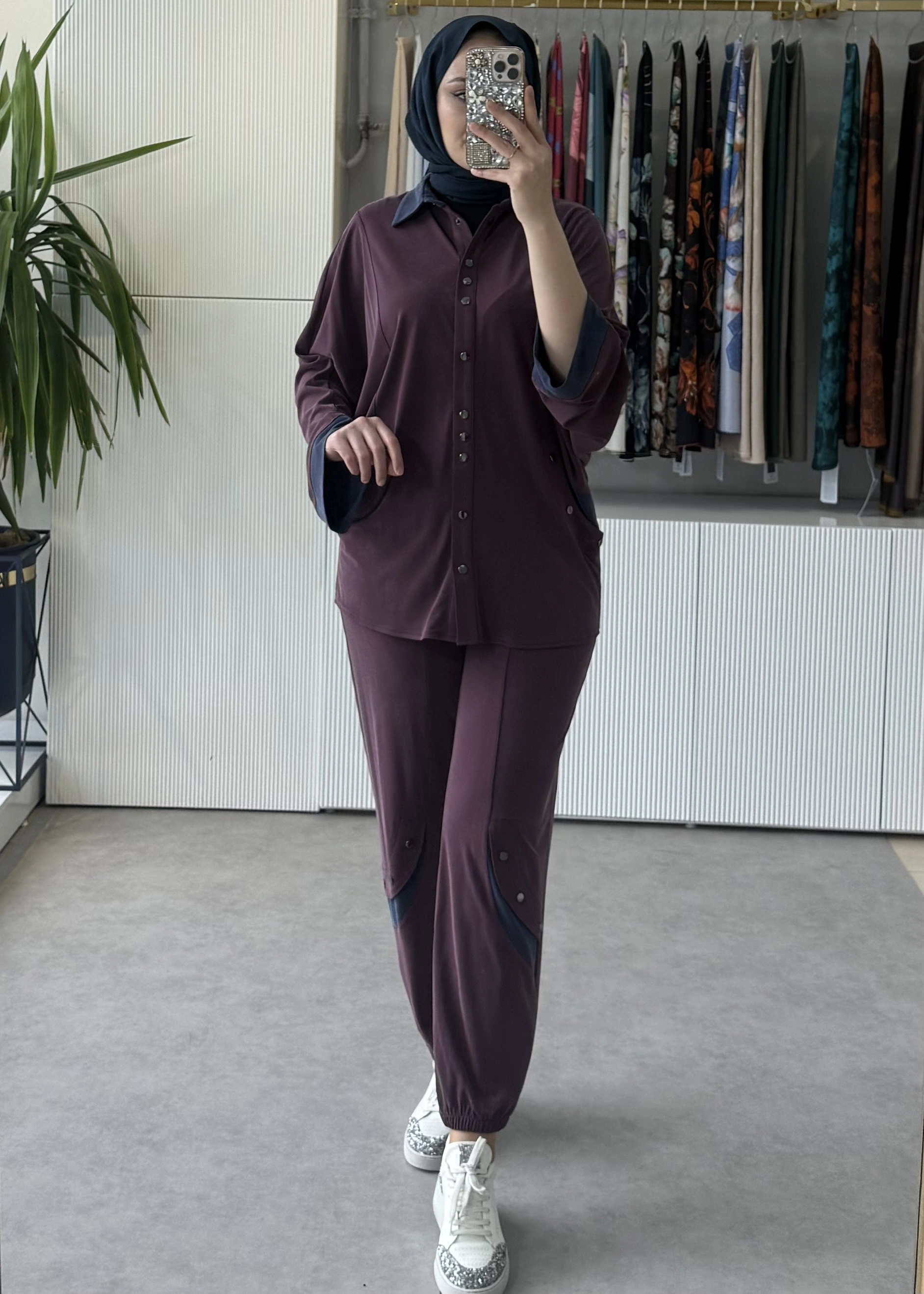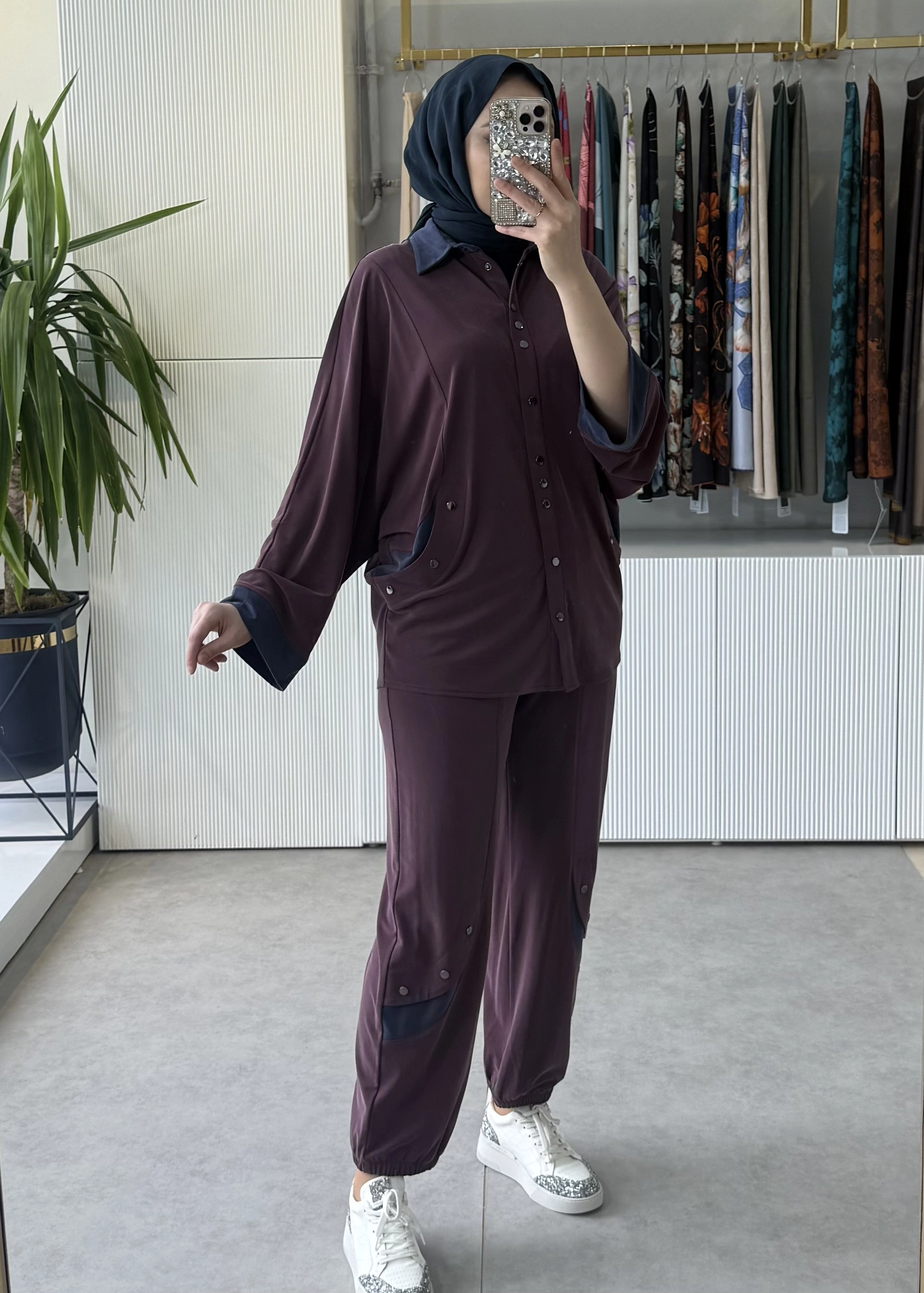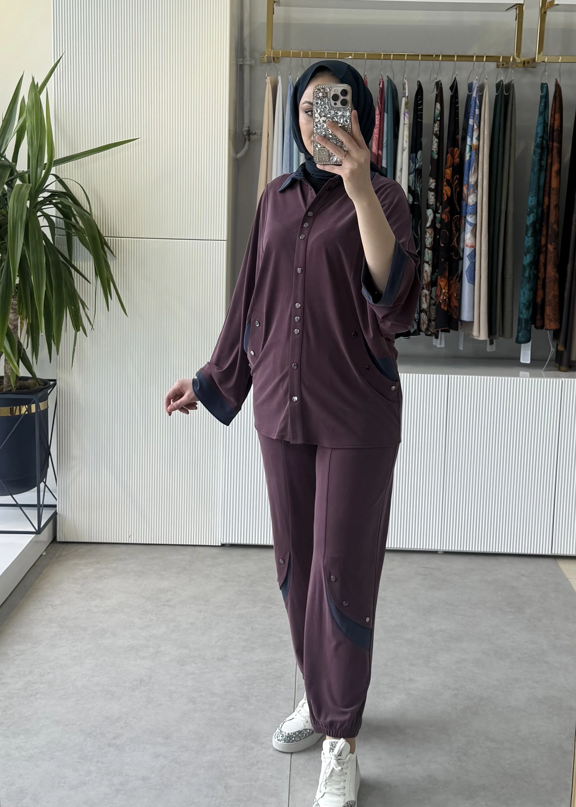 TIĞ TRİKO Kontrast Renk Garnili Metal Çıtçıtlı Tunik Pantolon Takım Bordo