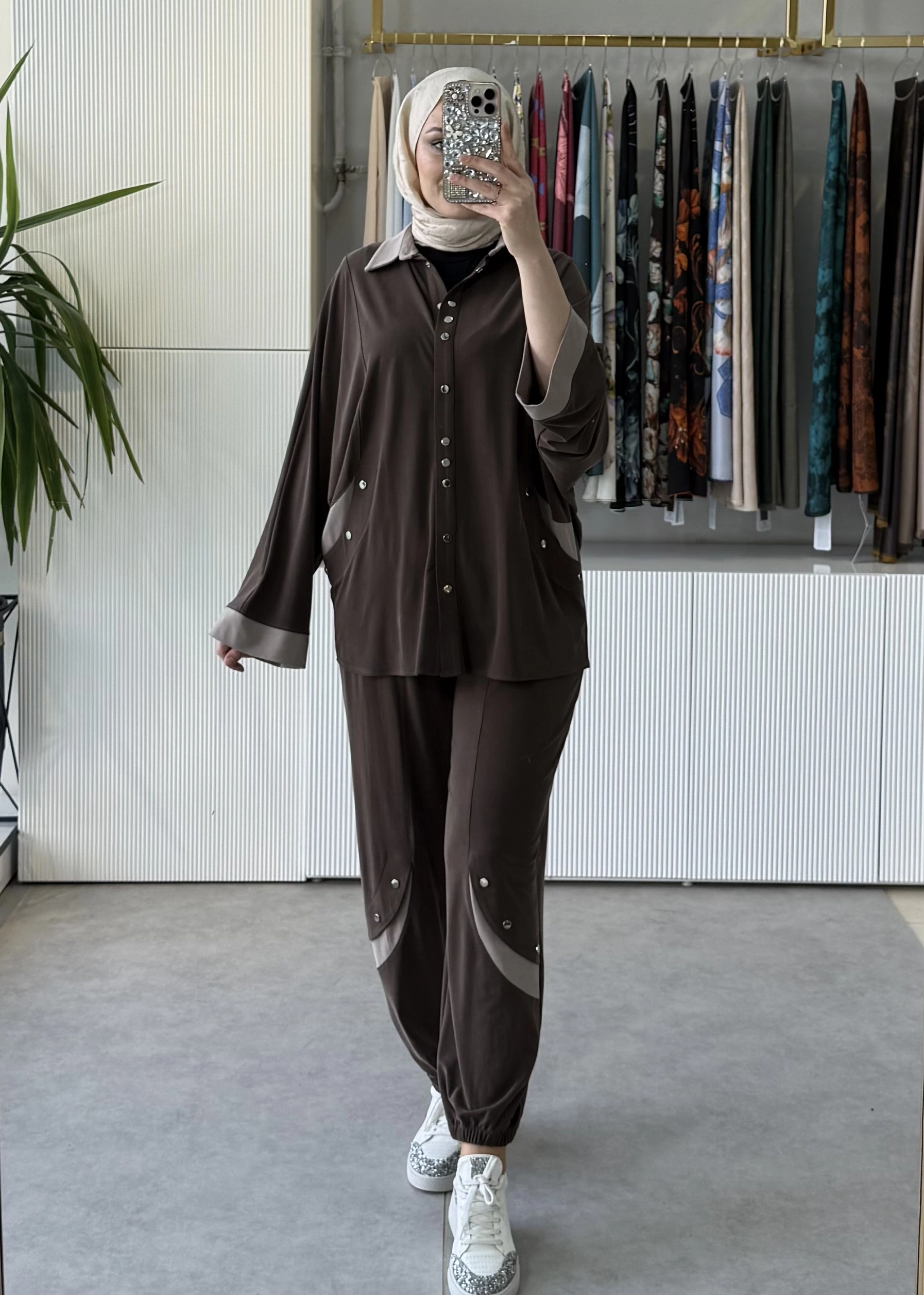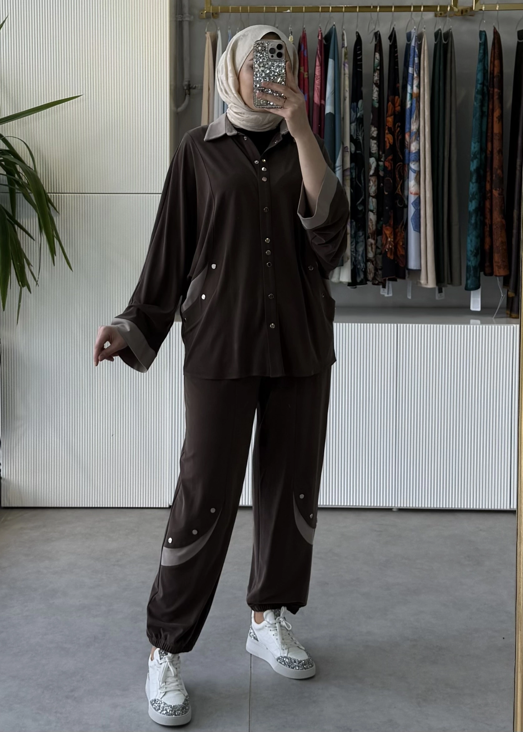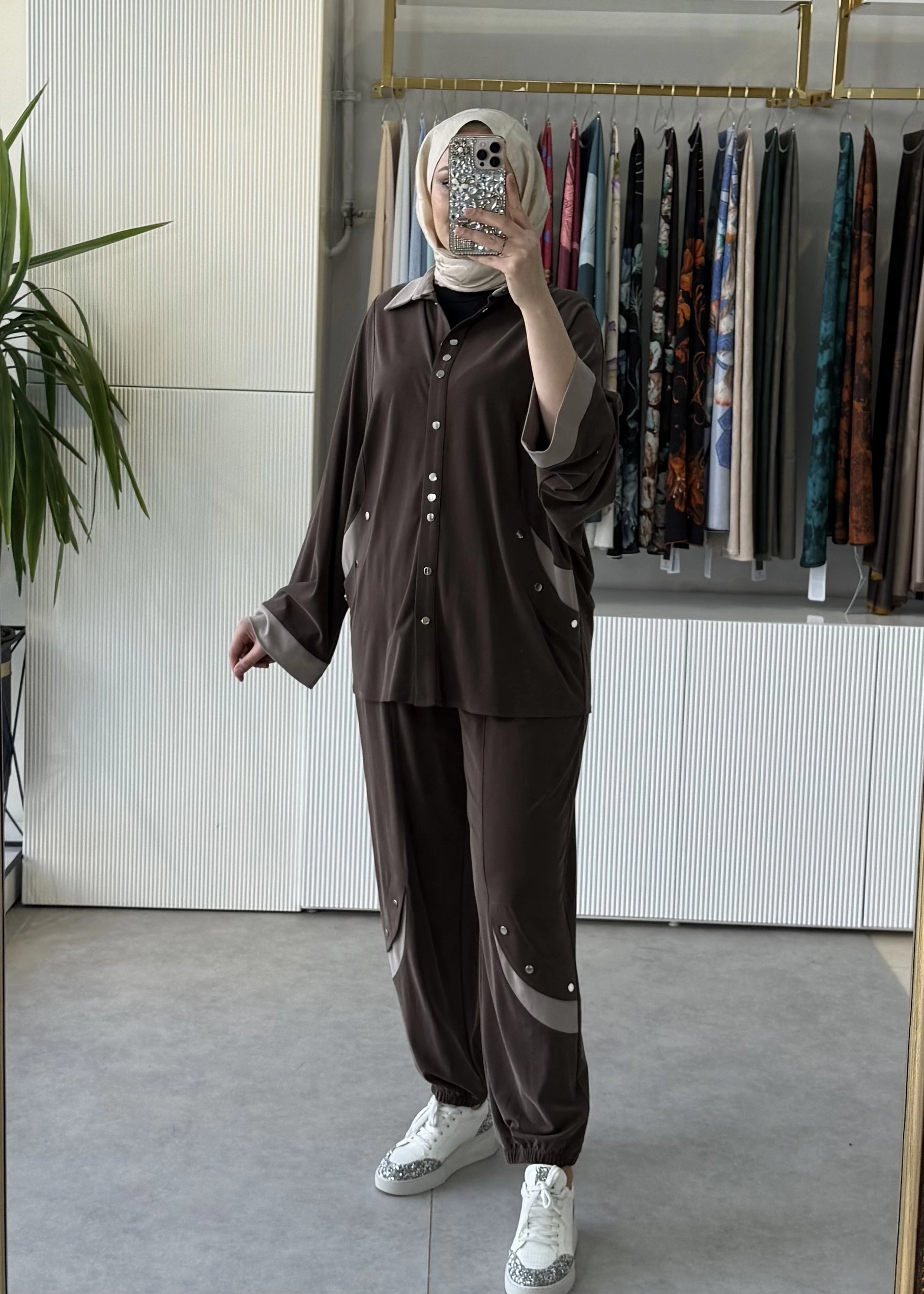 TIĞ TRİKO Kontrast Renk Garnili Metal Çıtçıtlı Tunik Pantolon Takım Kahve