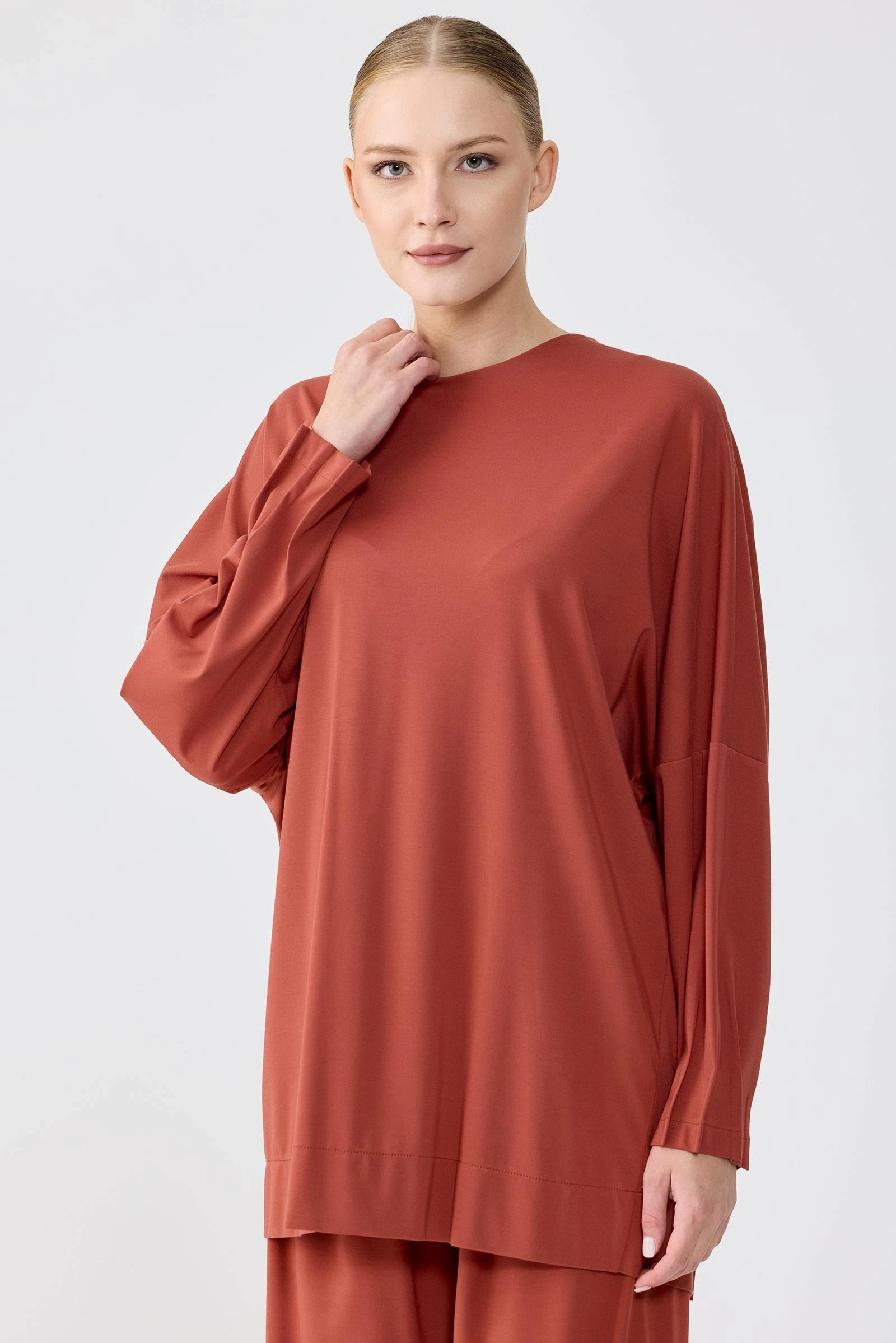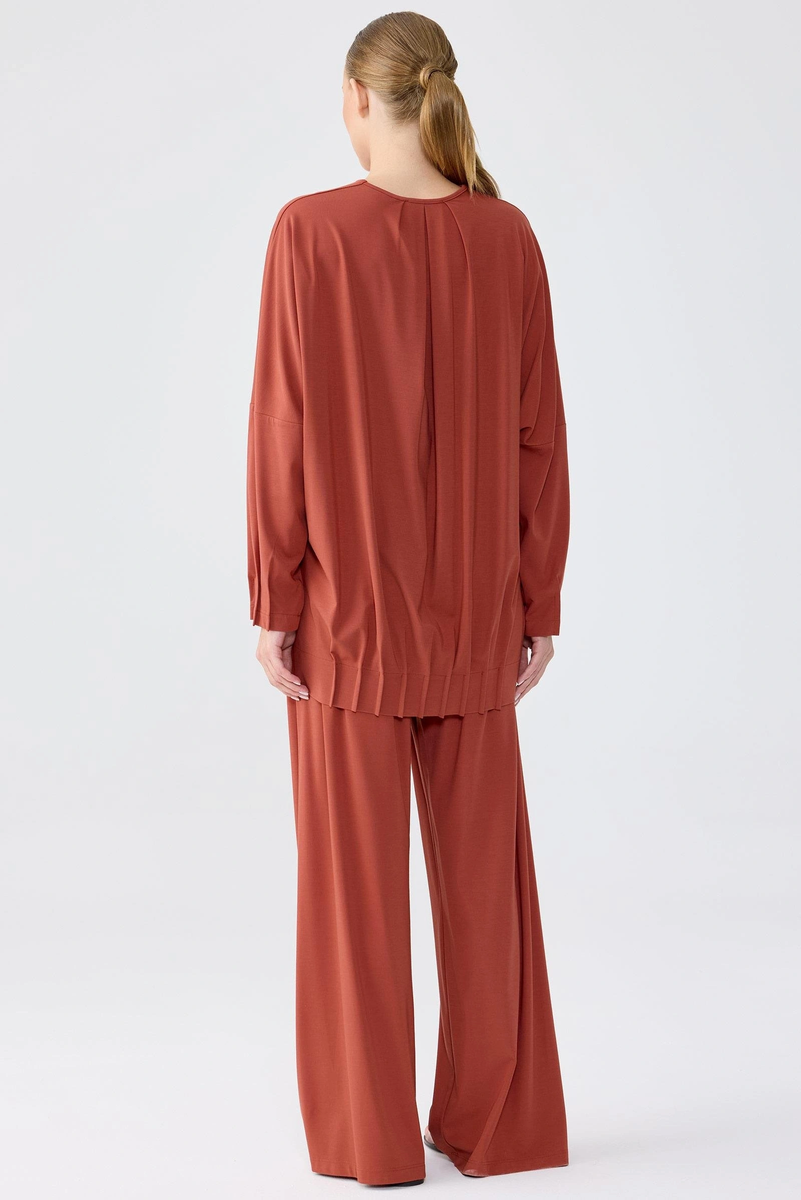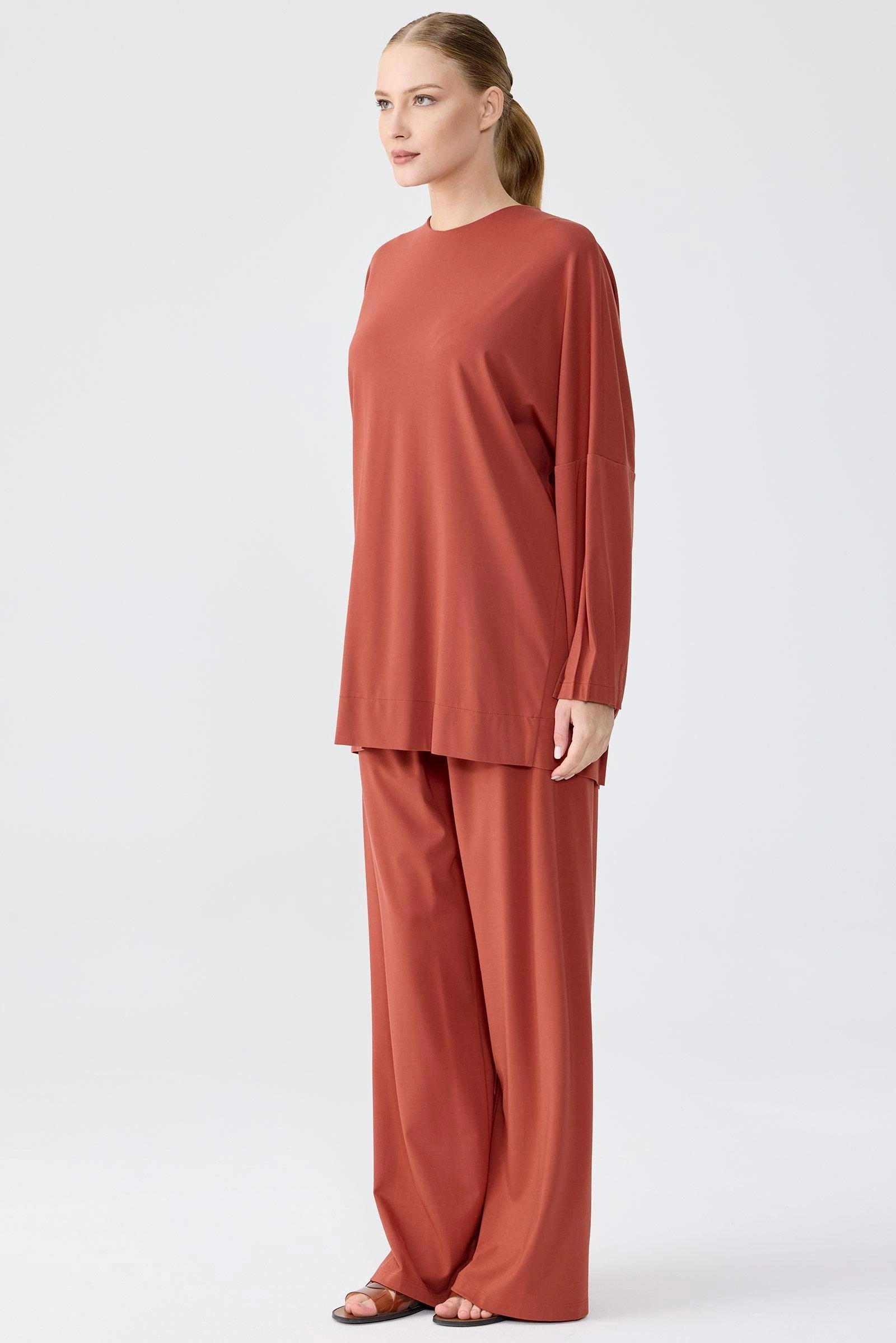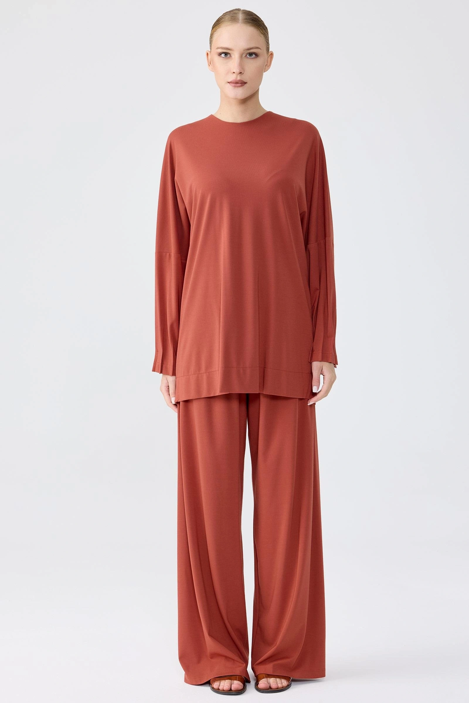 TIĞ TRİKO NERVÜR DETAYLI TUNİK PANTOLON TAKIM KİREMİT