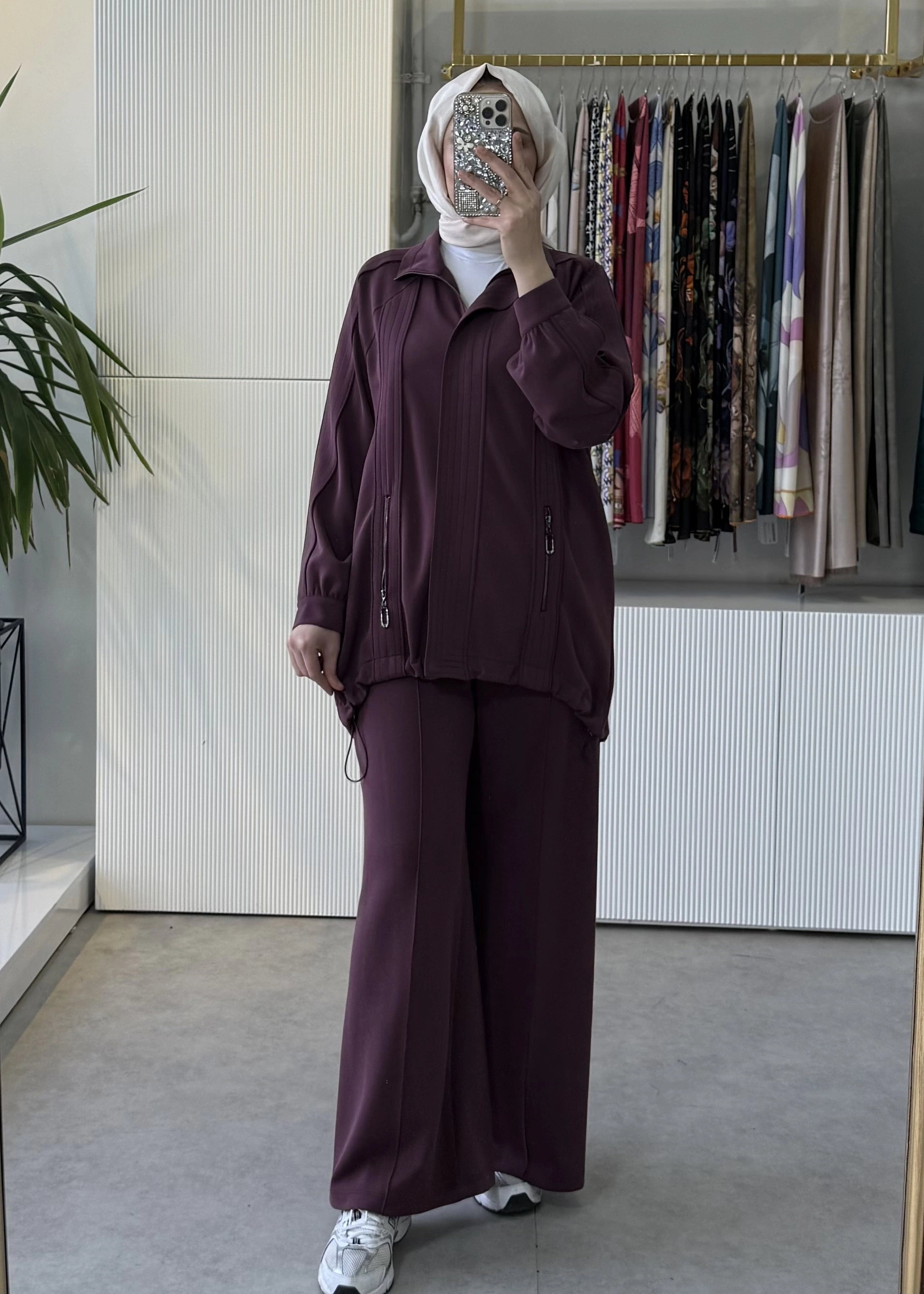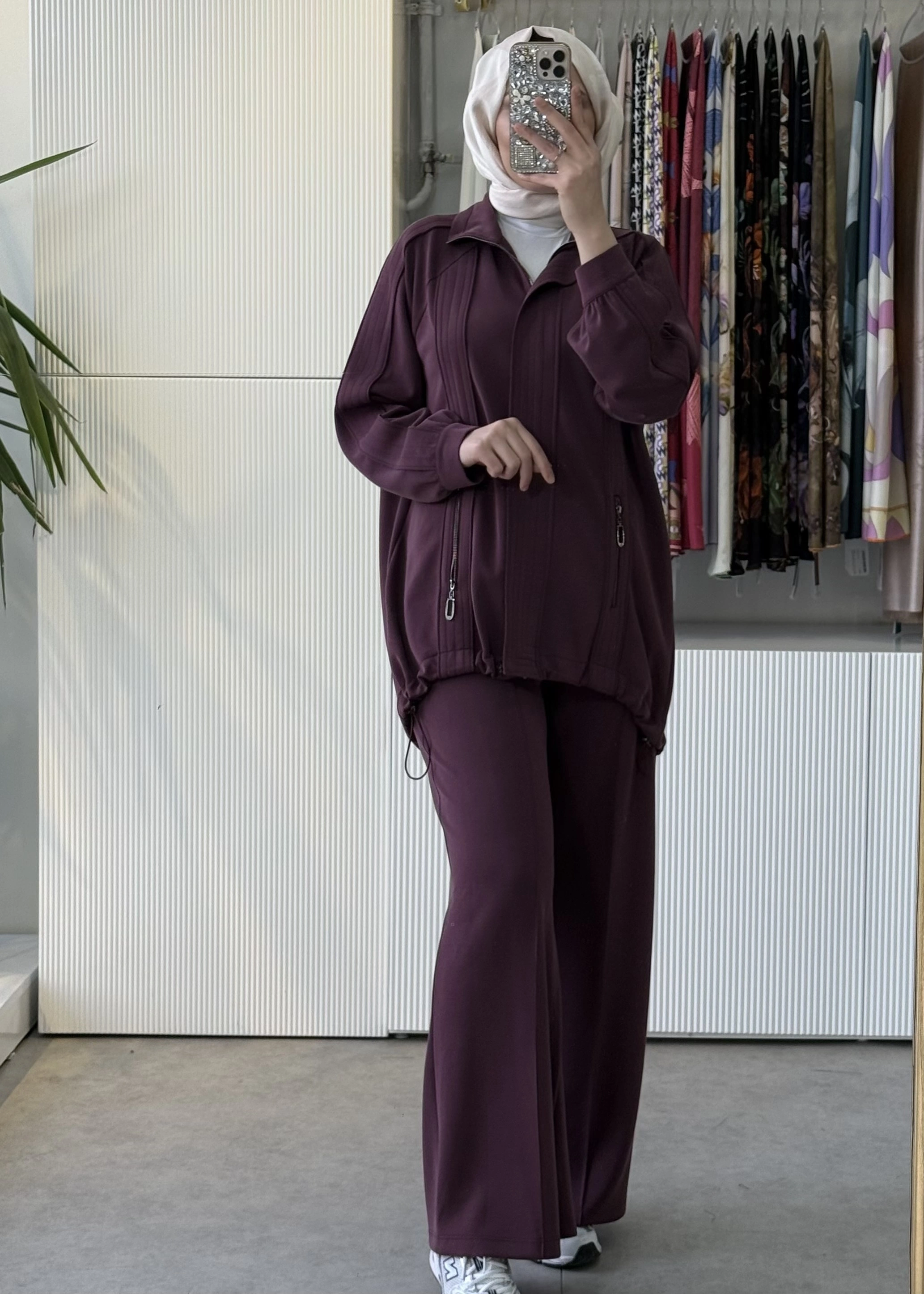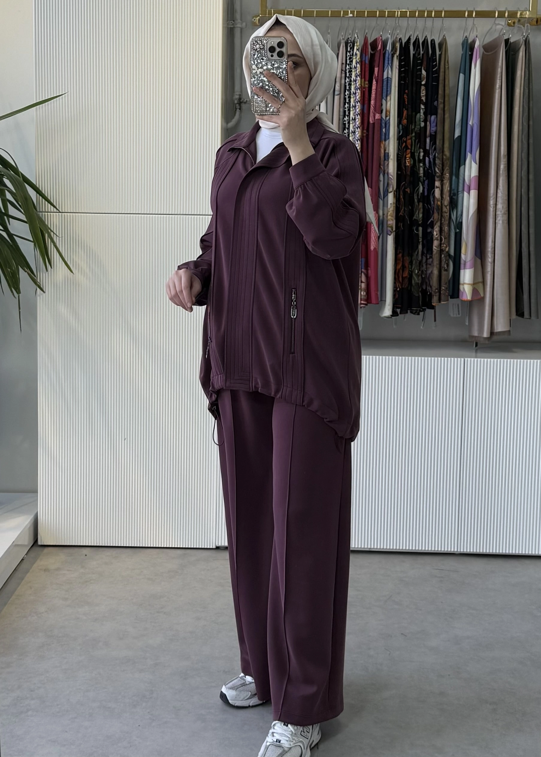 TIĞ TRİKO Spor Dikiş Detaylı Taşlı Elcikli Fermuar Cepli Pantolonlu Takım Bordo